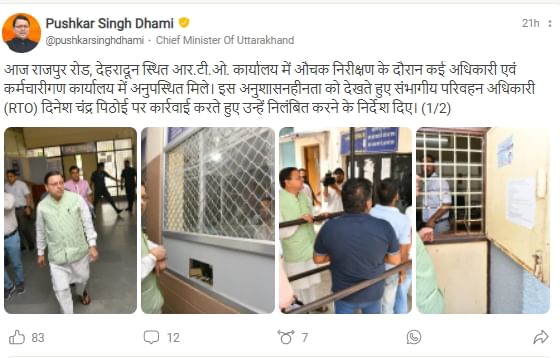मुख्यमंत्री पुष्कर सिंह धामी ने बुधवार को क्षेत्रीय परिवहन कार्यालय में छापा मारा। छापे के दौरान संभागीय परिवहन अधिकारी (आरटीओ) समेत बड़ी संख्या में कर्मचारी अनुपस्थित मिले। मुख्यमंत्री ने कड़ी नाराजगी जाहिर करते हुए मौके पर ही आरटीओ दिनेश चंद्र पठोई को निलंबित करने के निर्देश दिए, शाम को सचिव परिवहन ने उनके निलंबन आदेश जारी कर दिए। पठोई को परिवहन आयुक्त कार्यालय में संबद्ध कर दिया गया है।